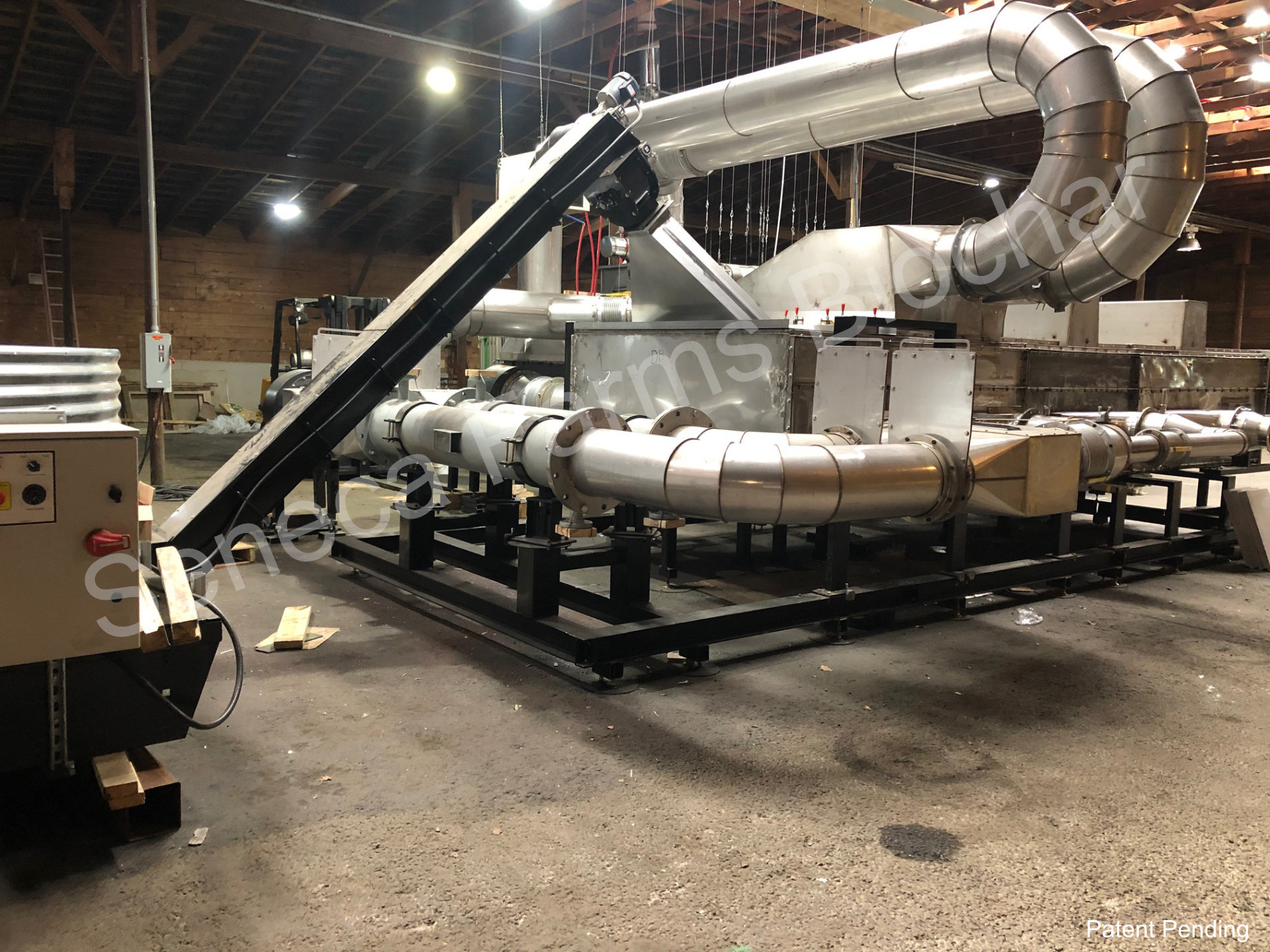Repair and maintenance costs for rotary kilns tend to be high. Just taking it apart, or lifting it a bit to replace the bearings, can be a challenge because it is so heavy. And of course, all that steel is expensive to begin with. This approach to distribute heat might be fine for a clothes dryer, but when scaled up to tonnes of biomass, it is too primitive to have the versatility and financial performance we need for our product line.
